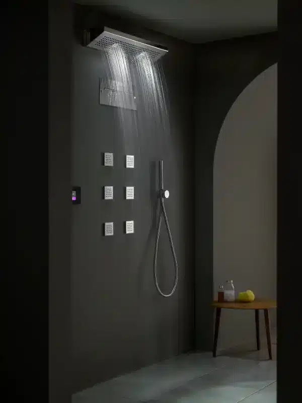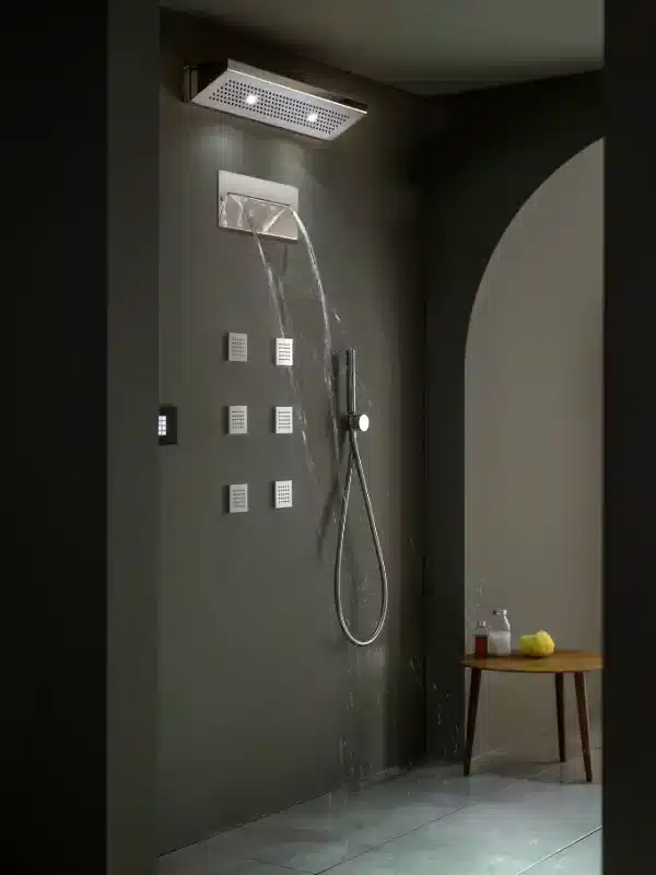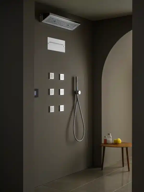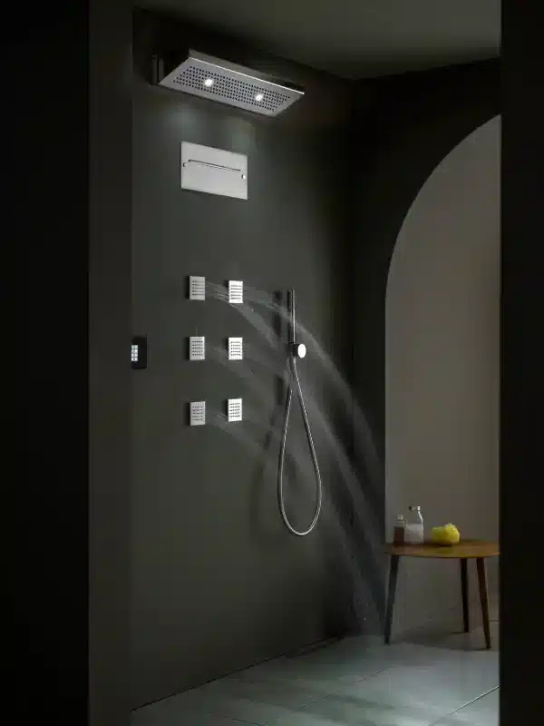 Il sistema doccia modulare consente di dare libero sfogo alla propria fantasia, componendo personalmente la propria emotional SPA secondo esigenze e desideri specifici. Il sistema è composto da una serie di moduli, diversificati tra getti d’acqua e luce, disponibili in varie finiture.